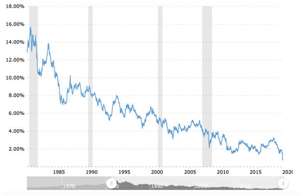 图:10年期美债收益率(灰色是危机期间,每次危机后收益率都是可预见的向下)